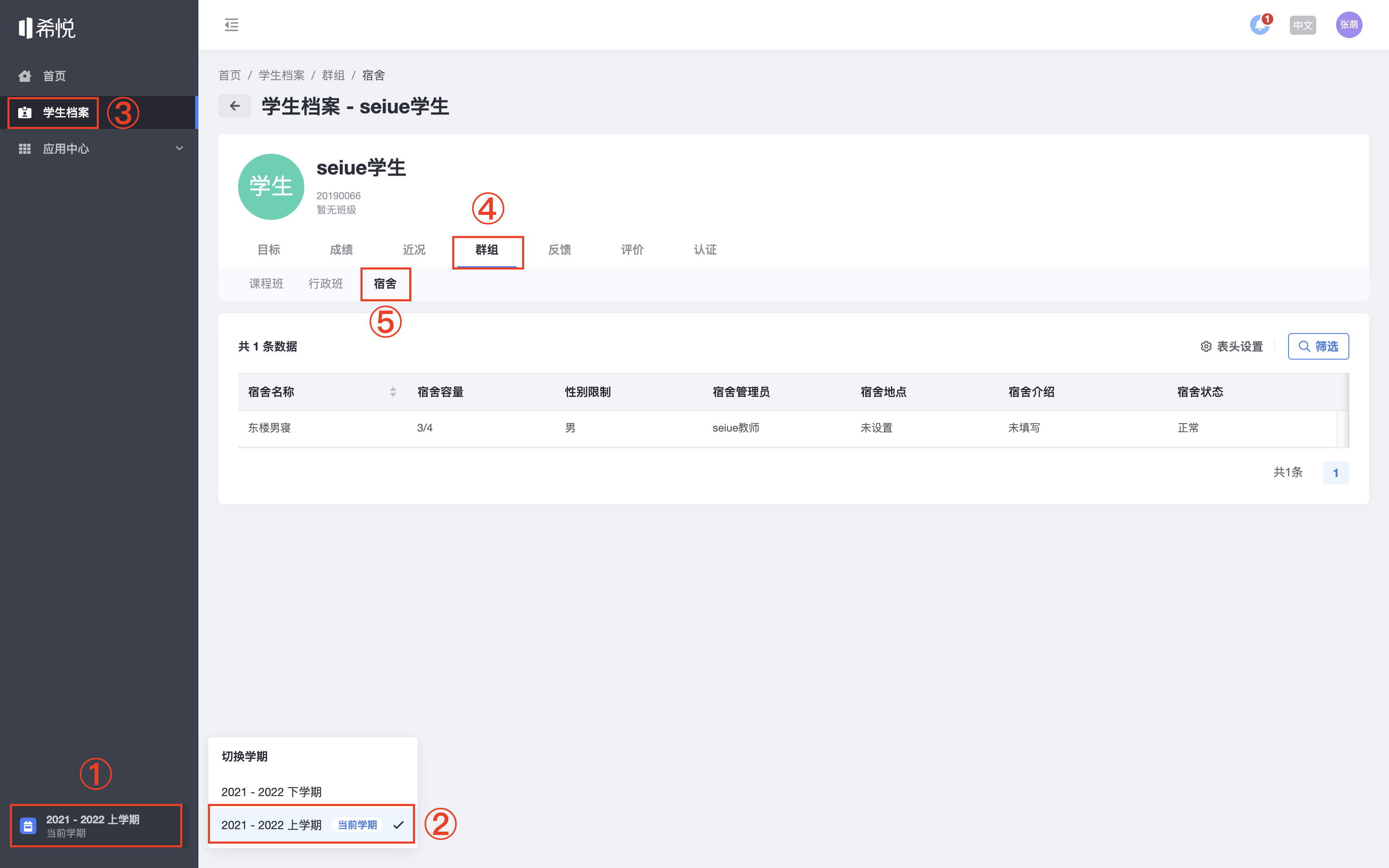 【学生档案-家长】查看宿舍 登录后,通过①和②,选择合适的学期,点击「学生档案」–「群组」–「宿舍」,下方显示即为目标学期的宿舍信息。 更新于 2022年3月14日 以上内容是否对您有帮助? 相关文章 【约谈-学生/家长】添加约谈记录(手机端) 【约谈-学生/家长】添加约谈记录 【约谈-家长】取消约谈(手机端) 【约谈-学生/家长】预约教师(手机端) 【约谈-家长】取消约谈 【约谈-学生/家长】预约教师