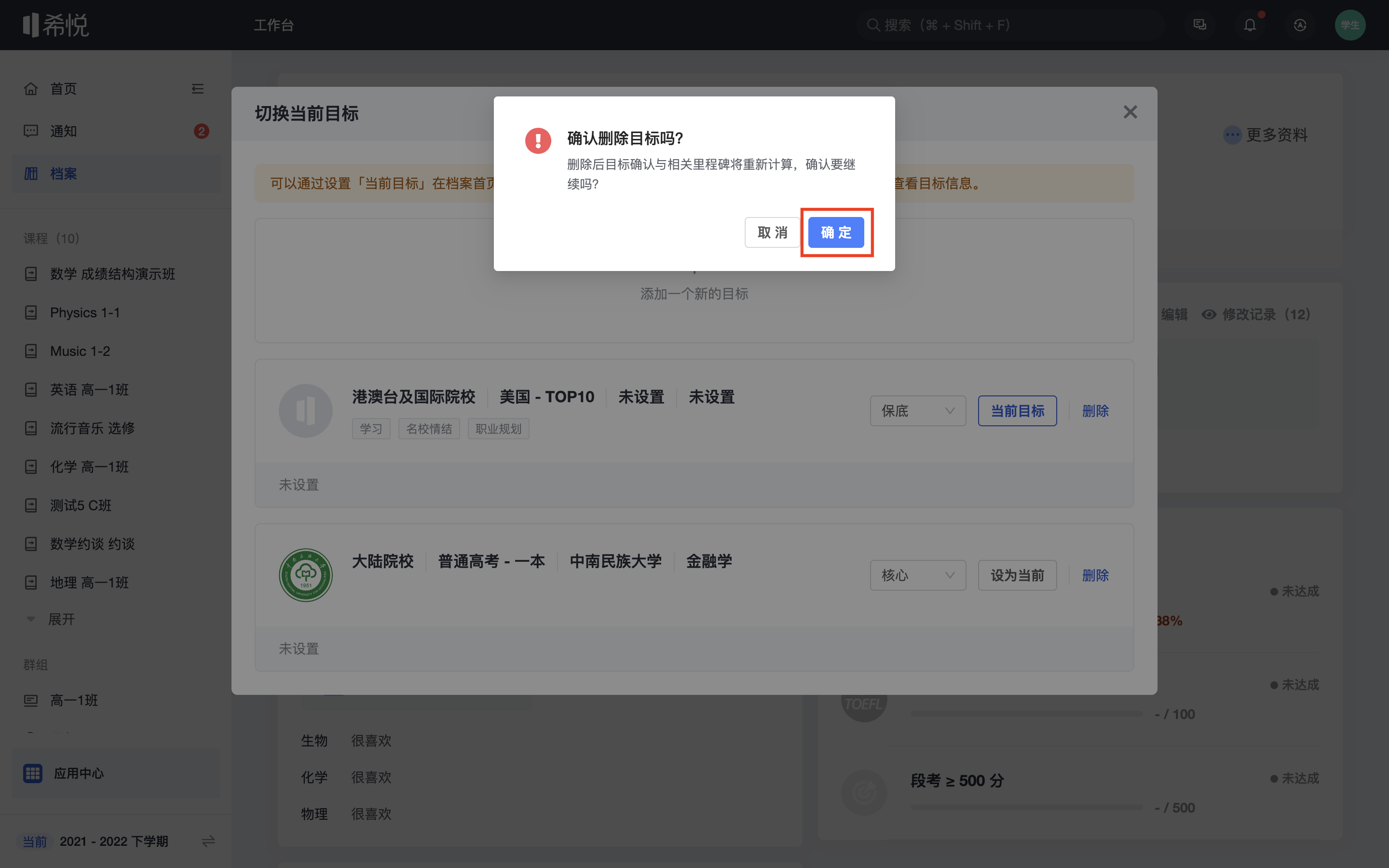 【目标管理-学生】删除个人学业目标 第一步:进入个人档案 登录后,点击「档案」进入页面。 第二步:删除个人学业目标 进入页面后,点击「目标」–「学业目标」–「切换当前目标」。 进入页面后,选择需要删除学业目标,点击「删除」。 弹出页面,点击「确定」即可。 更新于 2022年12月1日 以上内容是否对您有帮助? 相关文章 【约谈-学生/家长】添加约谈记录(手机端) 【约谈-学生/家长】添加约谈记录 【反馈列表-学生】发布反馈 【反馈列表-学生】回复反馈 【学生档案-学生】查看主页档案 【学生档案-学生】编辑学业目标
