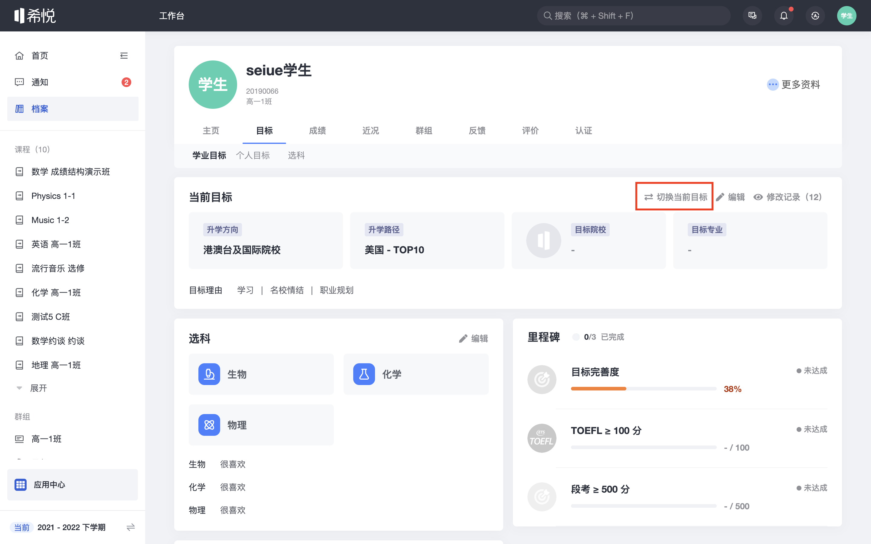 进入学业目标页面,点击「切换当前目标」进入页面。
