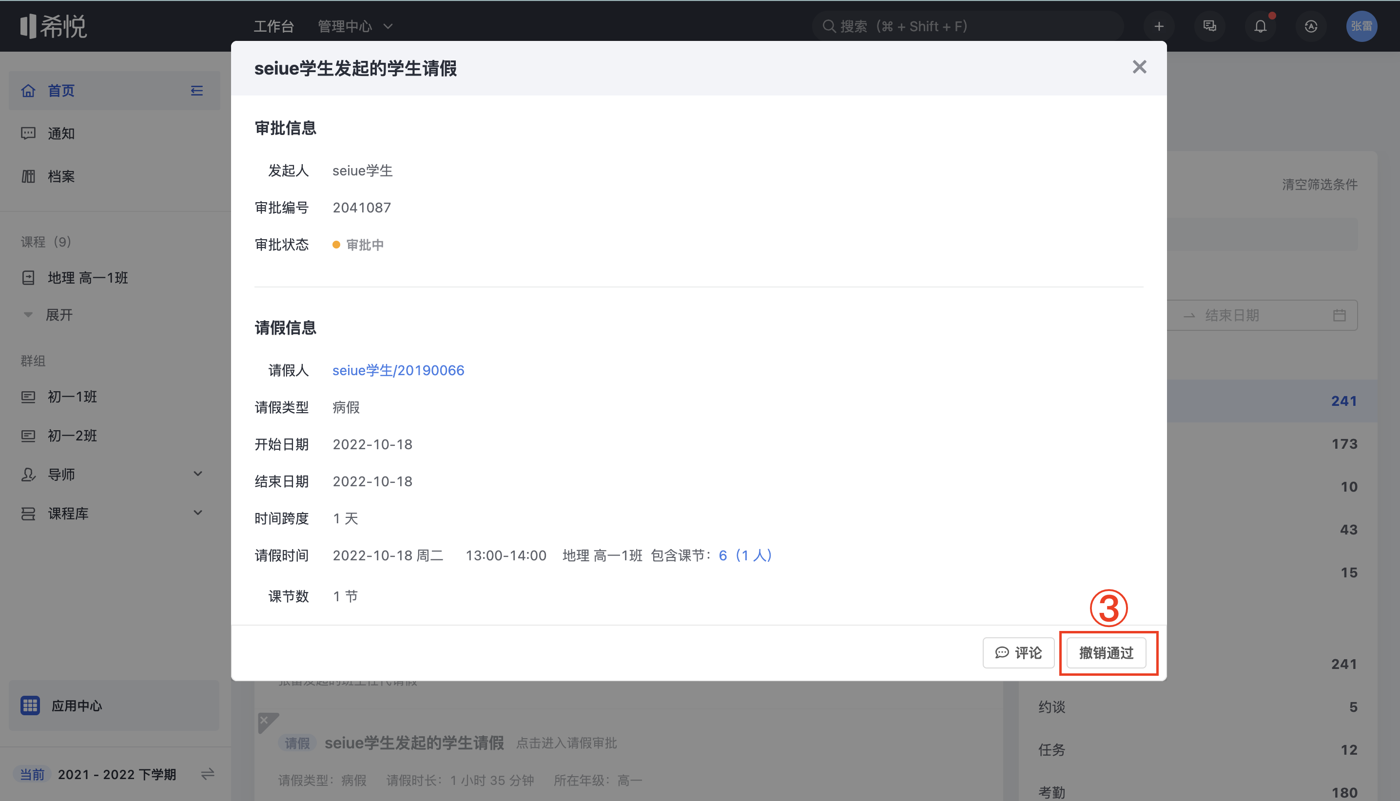 【请假-教师】撤销已审批的学生请假 登录后,点击「首页」-「待办」-「查看全部」,可以筛选关键字或者选择待办类型,进如页面,点击「撤销通过」或「撤销驳回」可以撤销审批。 更新于 2022年10月17日 以上内容是否对您有帮助? 相关文章 【认证-教师&学生】发放小红花实体卡片-操作视频 【宿舍-教师】导出学生考勤统计 【宿舍-教师】查看学生考勤统计 【宿舍-教师】查看宿舍考勤统计 【宿舍-教师】录入宿舍考勤 【宿舍-教师】宿生评价录入