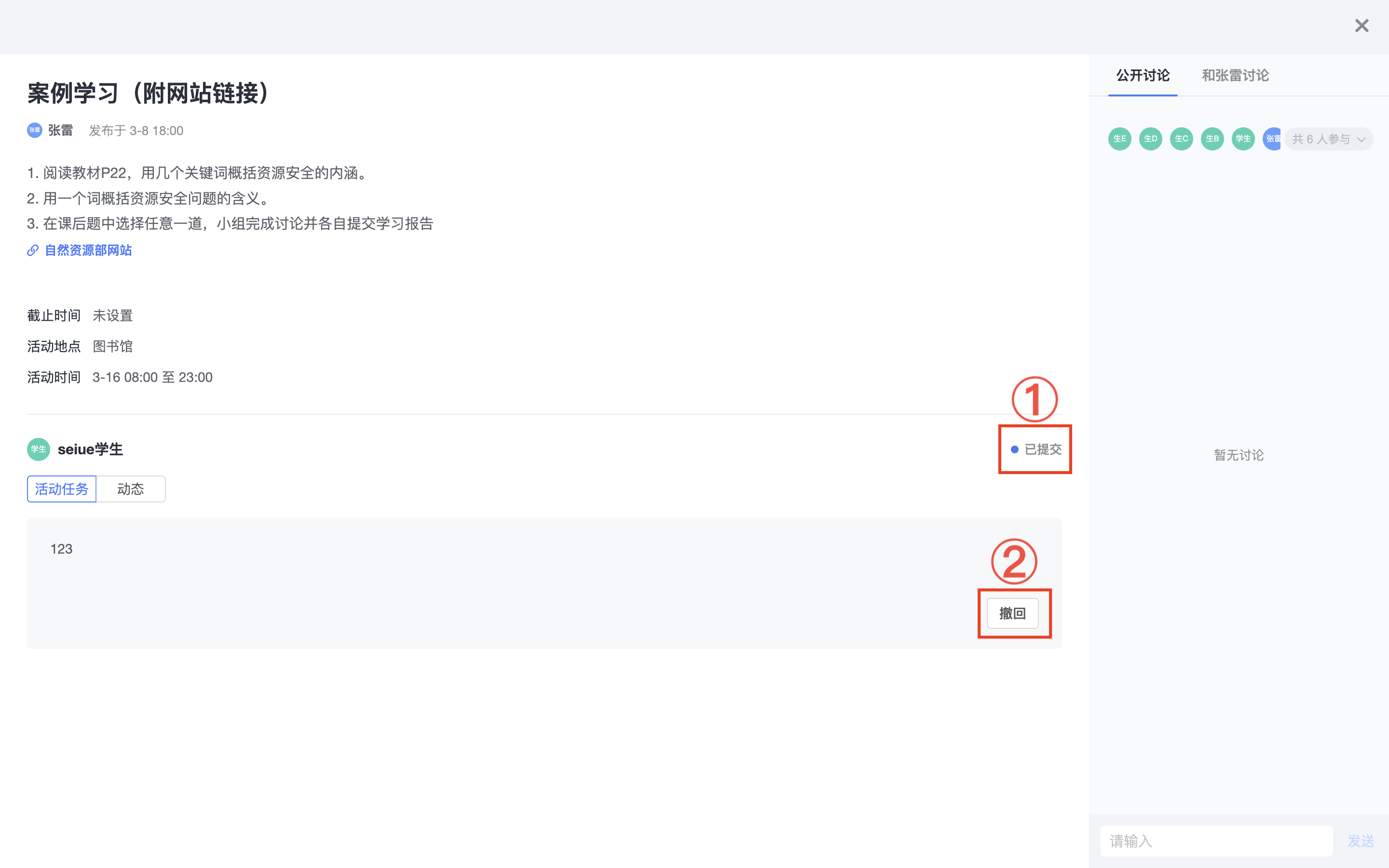 提交后,页面显示“已提交”即表示提交成功。如果提交内容需要修改,点击「撤回」修改后再提交即可。