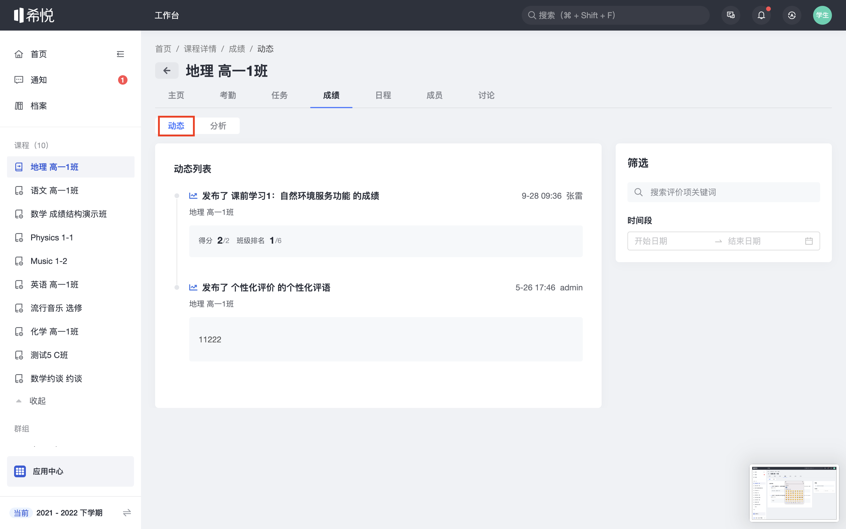 进入页面后,点击「成绩」,可查看学生在此课程班下的成绩情况,包括成绩动态和成绩分析。