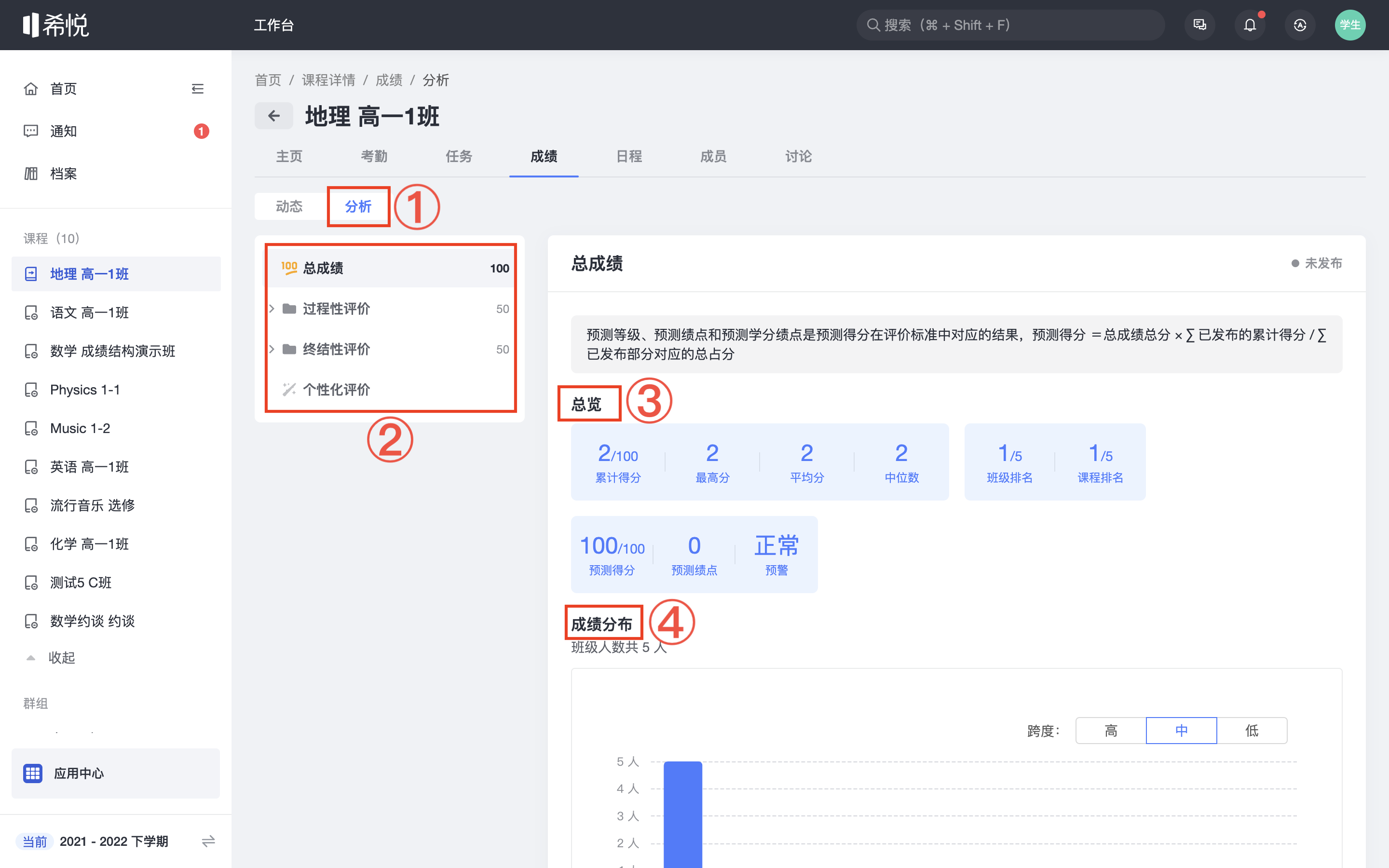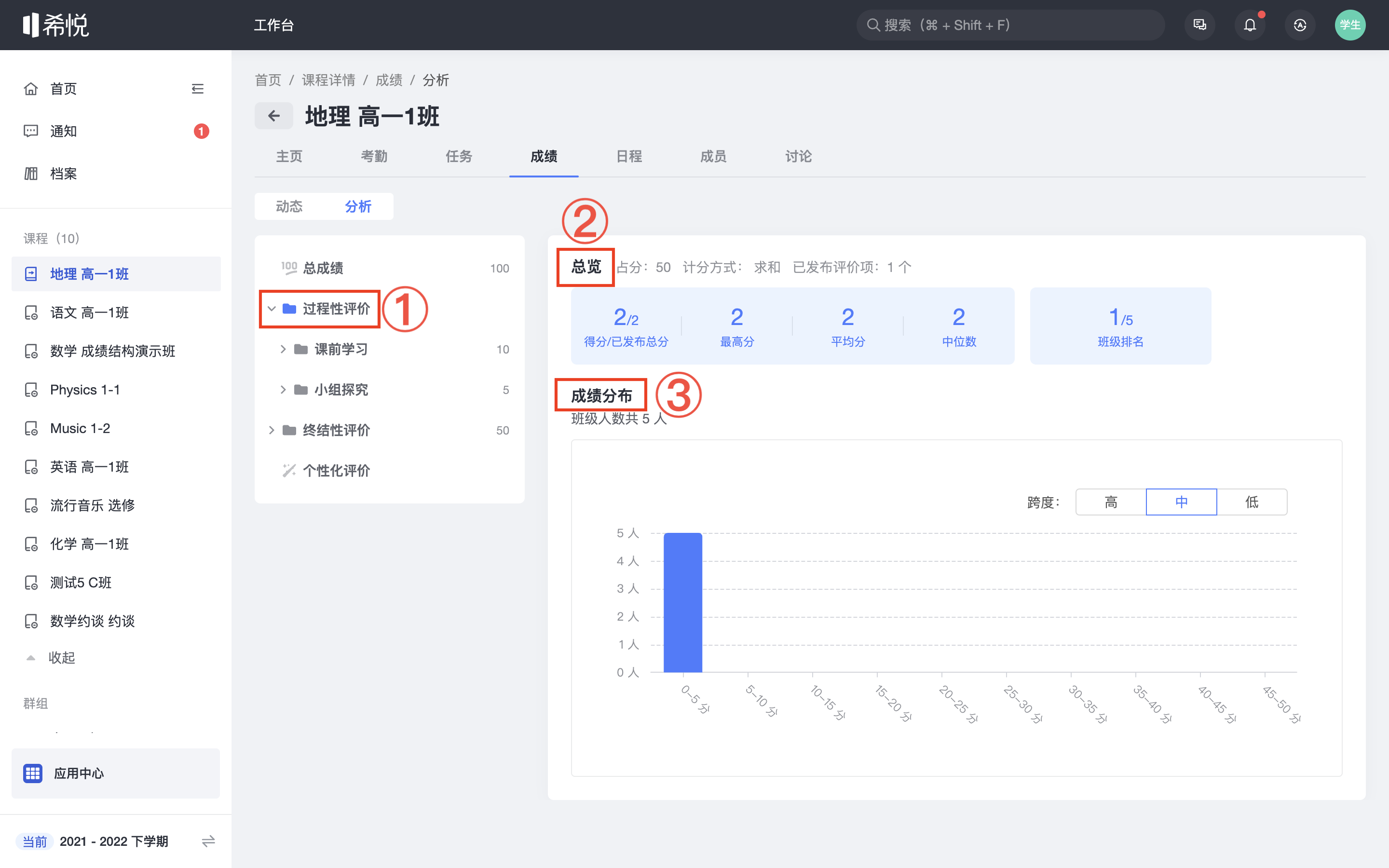 点击「分析」,即可查看此课程下学生总成绩及各项评价项的分析情况。