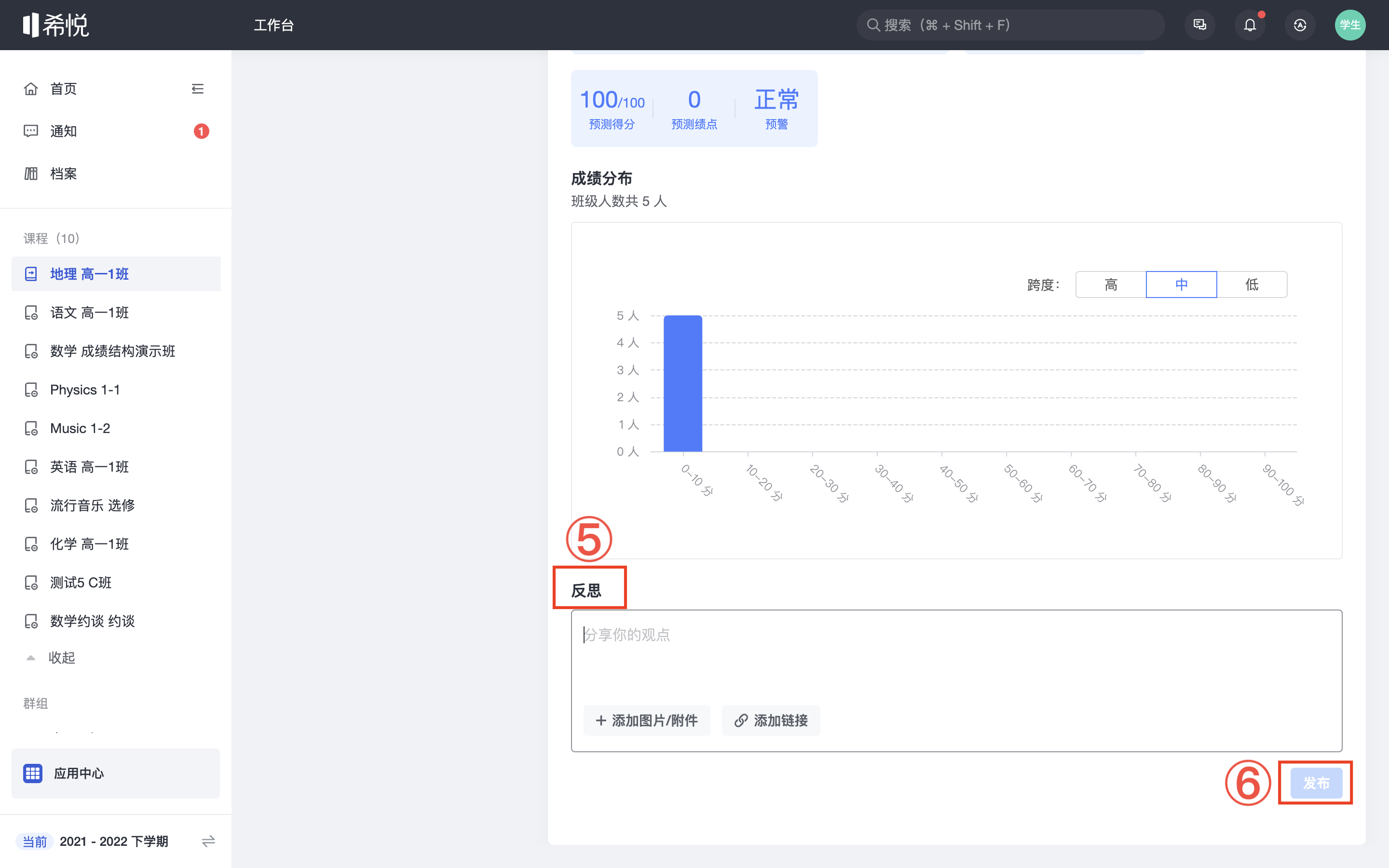 点击「总成绩」可查看个人排名,并且针对成绩可以进行反思,填写完反思内容后,点击「提交」即可;