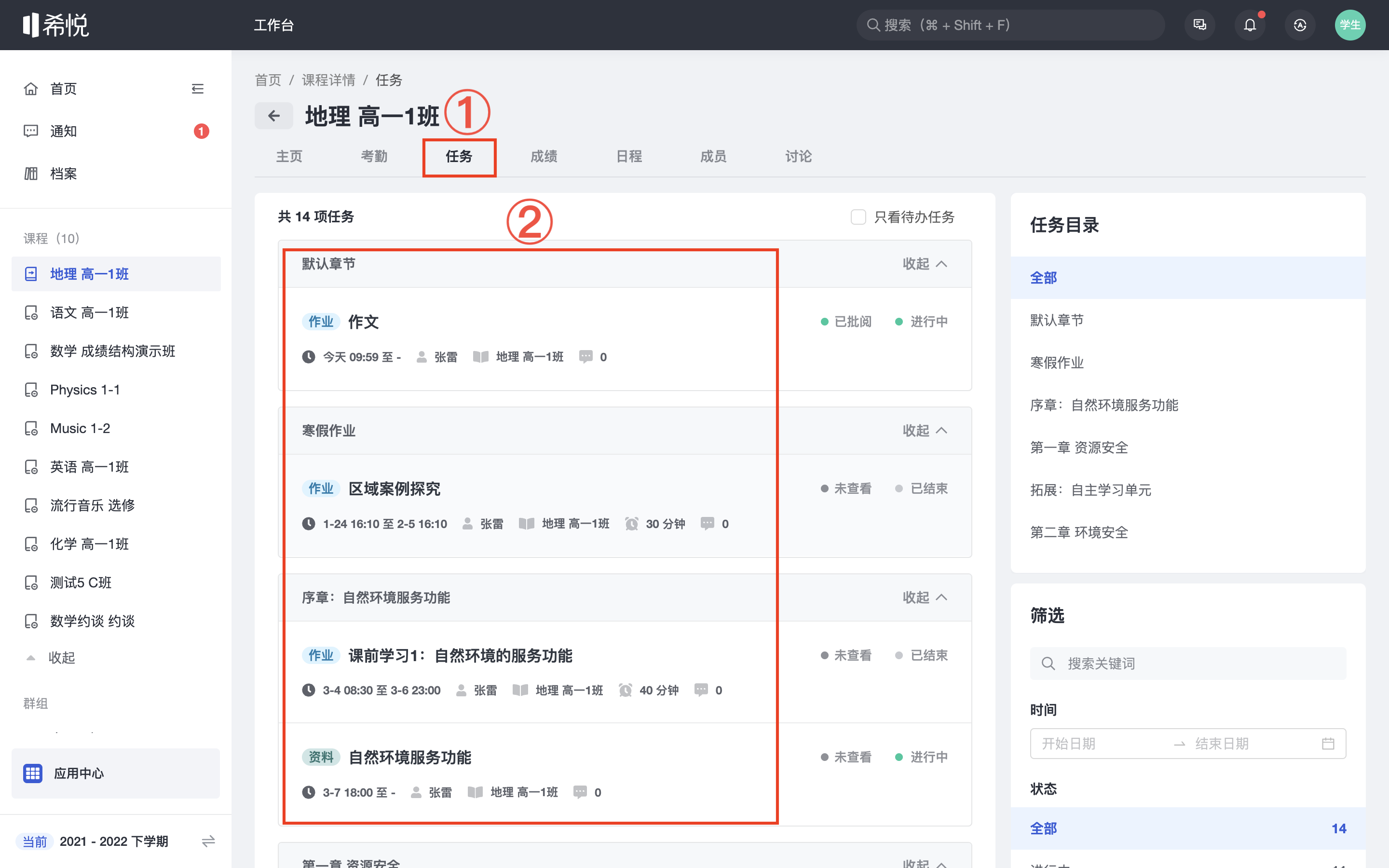 弹出页面后,点击「任务」,学生即可查看课程班内设置的各项任务,可点击选择某一项任务,查看详情。