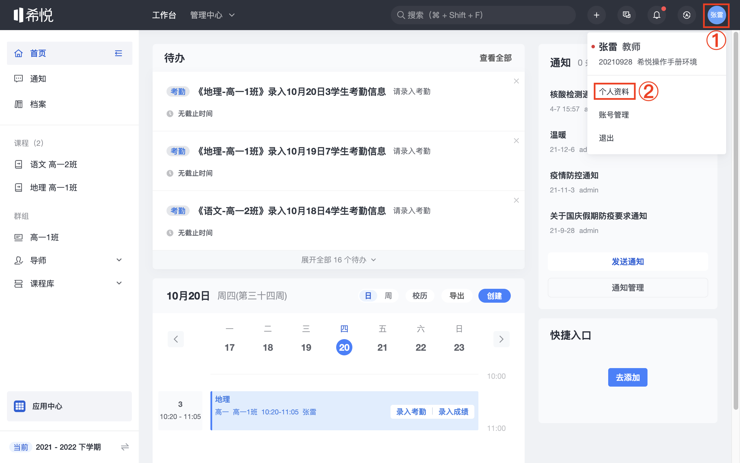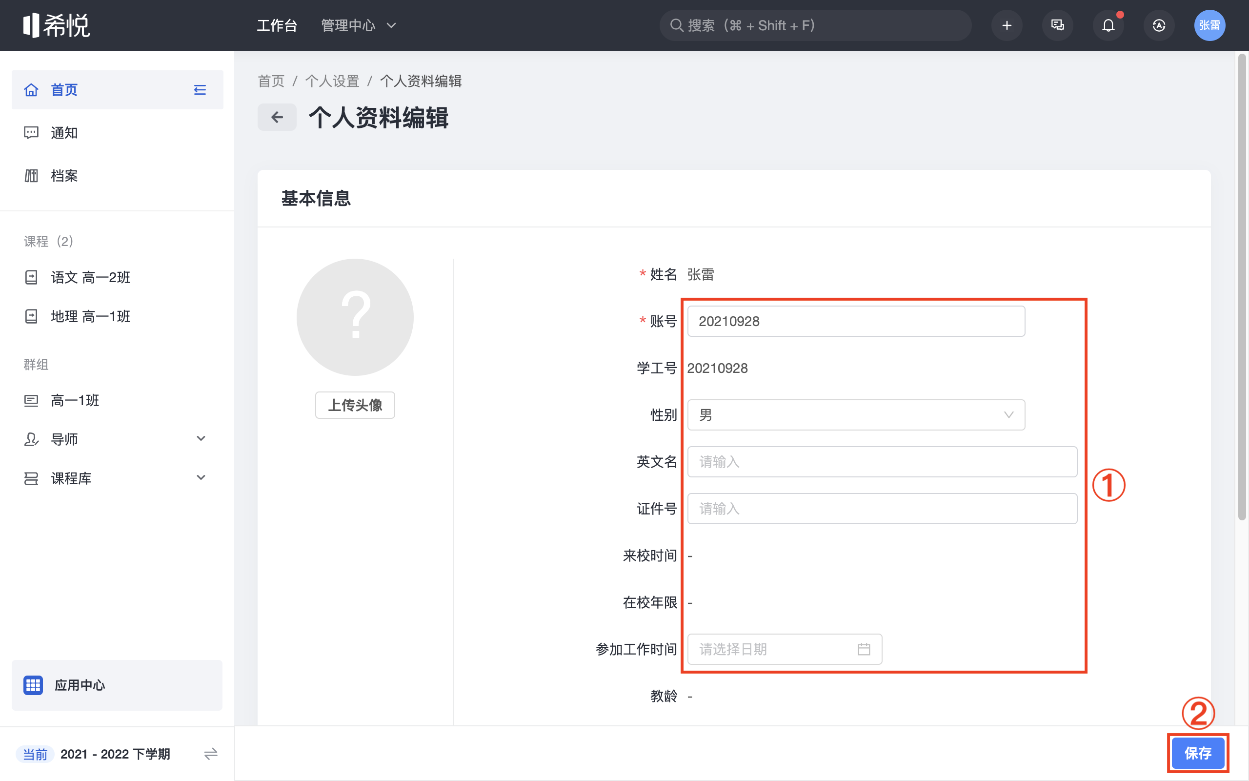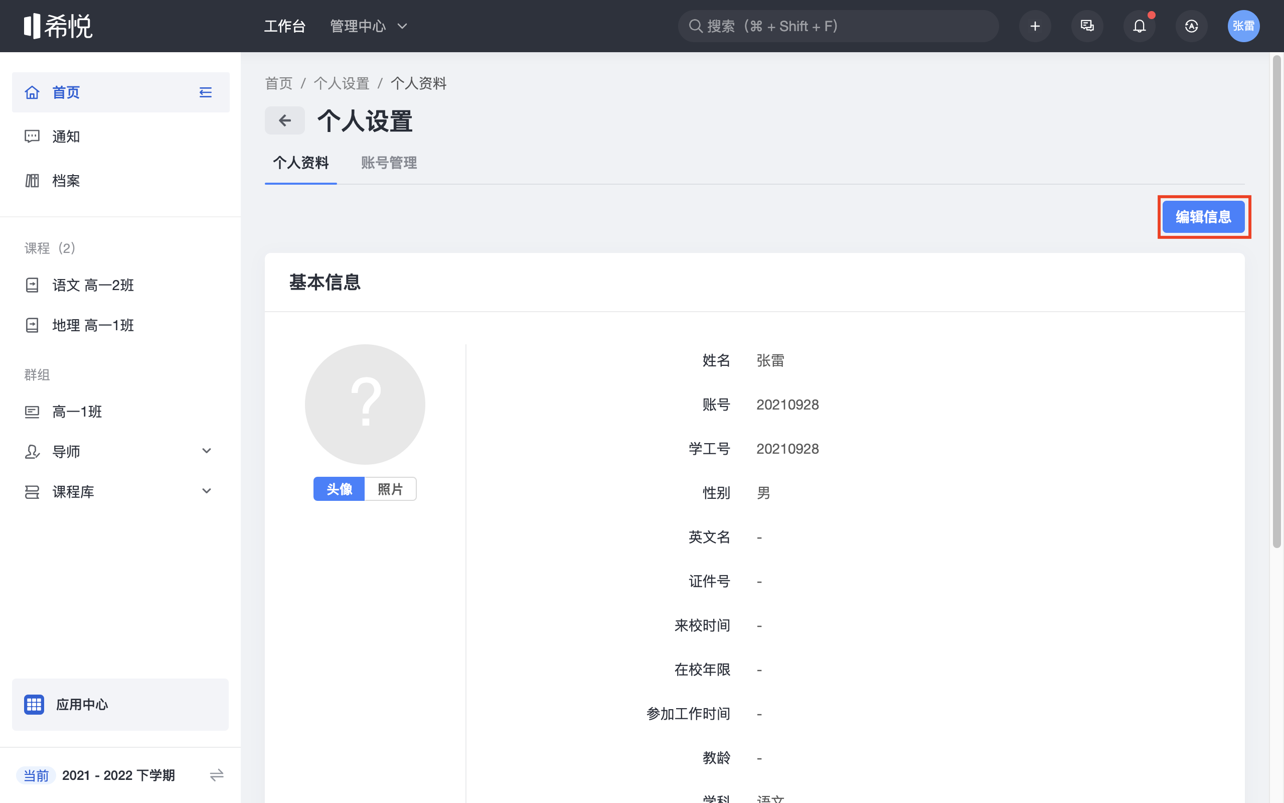 【首页】修改个人资料 第一步:进入个人资料页面 登录系统后,点击首页右上角的「用户头像」,点击「个人资料」,进入个人资料页面。 第二步:修改个人资料 点击右上角「编辑信息」。 修改个人资料后,点击「保存」完成修改。 更新于 2022年10月21日 以上内容是否对您有帮助? 相关文章 【待办】查看待办 【账号管理】解绑邮箱 【账号管理】解绑手机号 【账号管理】更换手机号 【账号管理】绑定微信 【账号管理】解除微信绑定